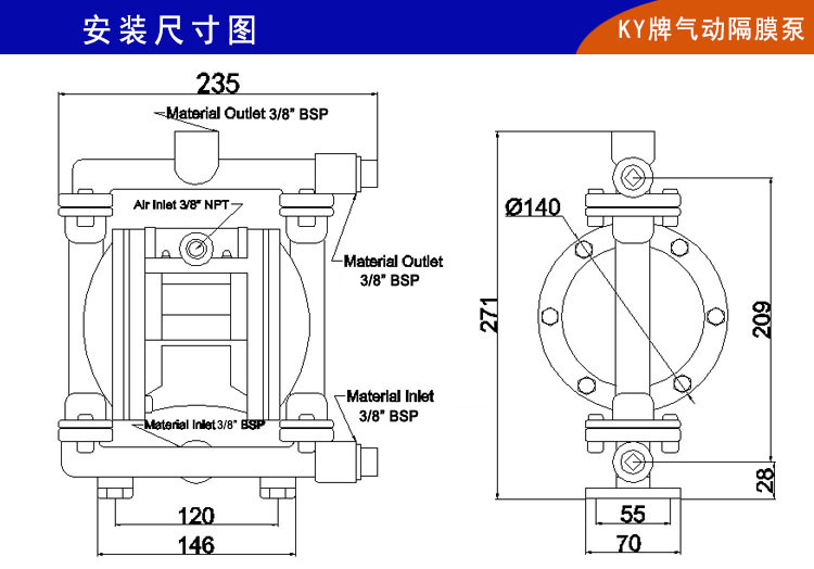 14、KY氣動(dòng)隔膜泵整體構(gòu)造上更加優(yōu)化,泵腔和主管路都有明顯加強(qiáng),自吸功能和流量揚(yáng)程都有很大改善(最大流量/54立方/小時(shí),最大揚(yáng)程80米);被客戶成為超大流量氣動(dòng)隔膜泵和壓濾機(jī)專用氣動(dòng)隔膜泵。