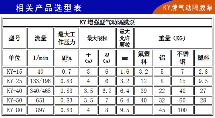 6)、KY增強型氣動隔膜泵整體構造上更加優化,泵腔和主管路都有明顯加強,自吸功能和流量揚程都有很大改善,并且可通過氣閥開度實現無級調節